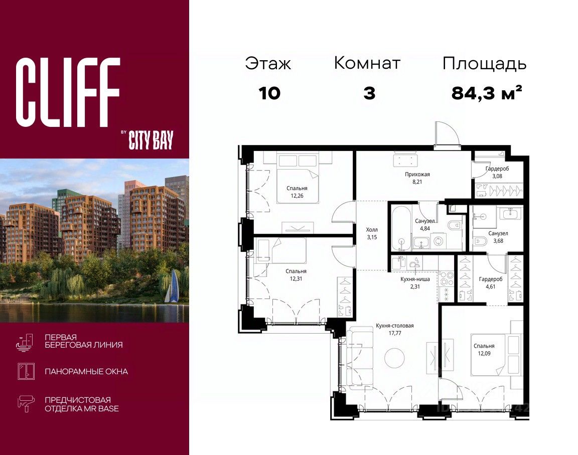 Продаётся 3-комнатная квартира общей площадью 84.31 м² с предчистовой отделкой в ЖК Сити Бэй, квартале Cliff, на 10-м этаже 15 этажного дома.