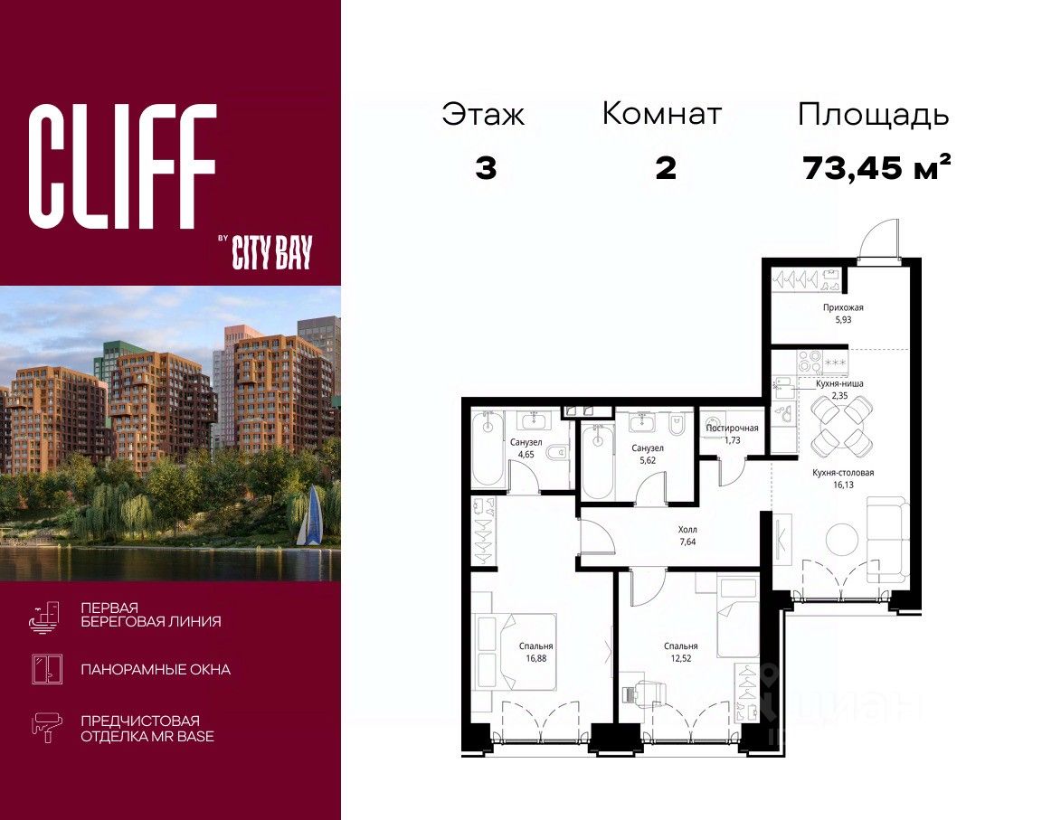 Продаётся 2-комнатная квартира общей площадью 73.45 м² с предчистовой отделкой в ЖК City Вау, квартале Cliff, на 3-м этаже 15 этажного дома.