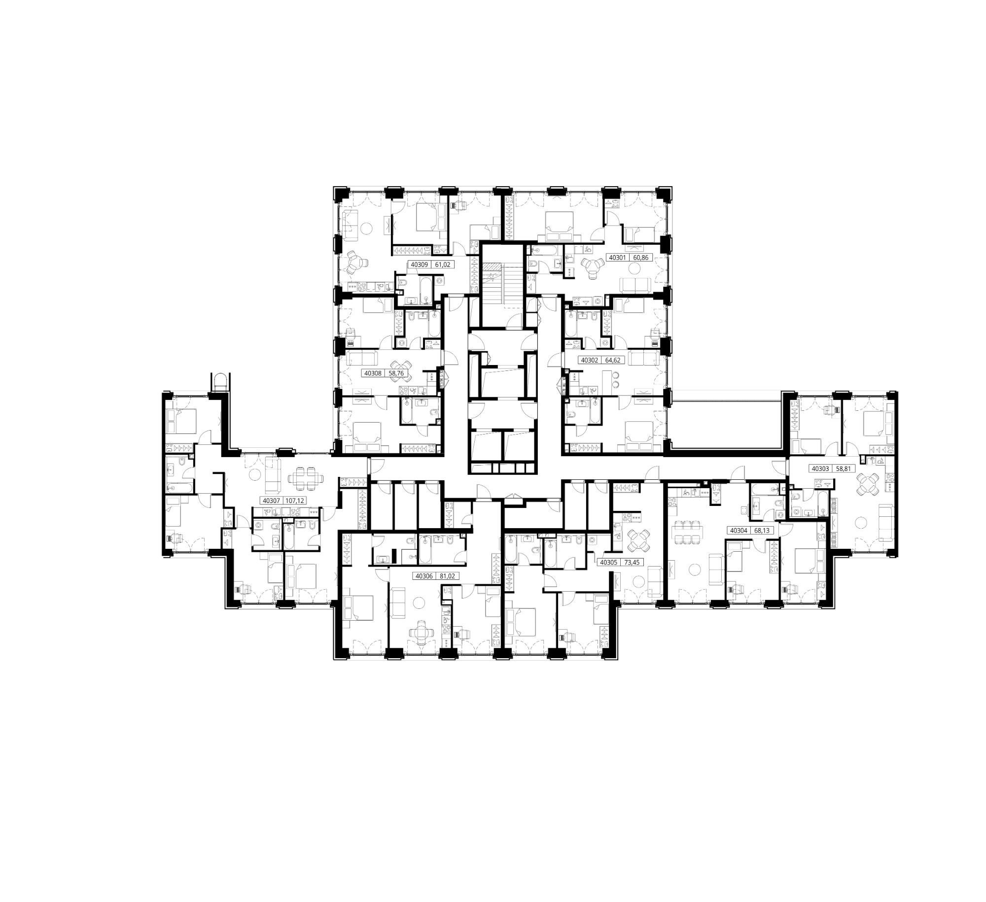 В каждом здании комбинируется максимальное количество и разнообразие форматов квартир: от видовых квартир с зелеными террасами и лоджиями до квартир малого формата.