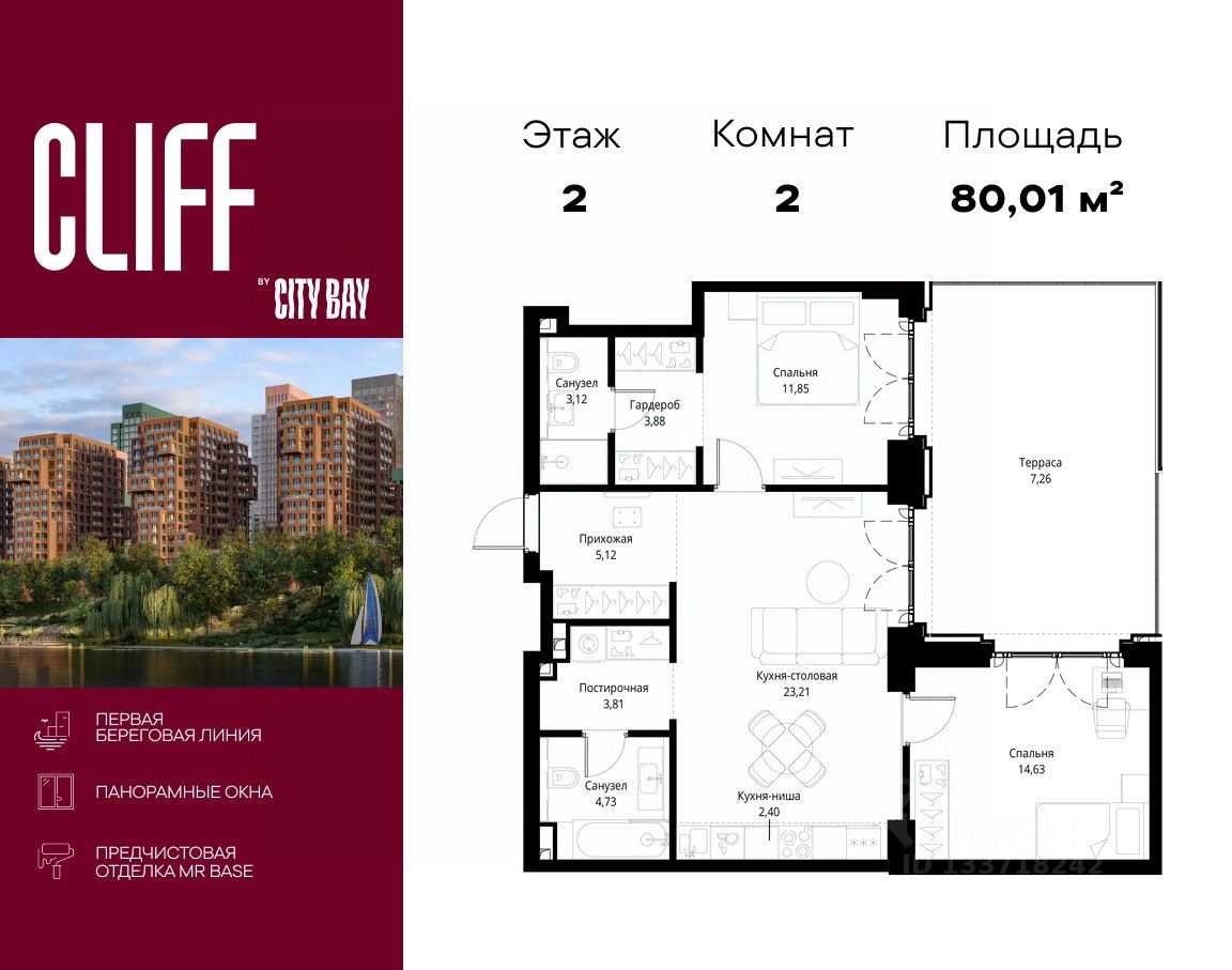 Продаётся 2-комнатная квартира общей площадью 80.01 м² с предчистовой отделкой в ЖК City Вау, квартале Cliff, на 2-м этаже 15 этажного дома.