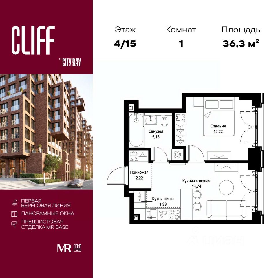 Продаётся 1-к квартира общей площадью 36.30 м² с предчистовой отделкой в ЖК City Вау, квартале Cliff, на 4-м этаже 15 этажного дома.