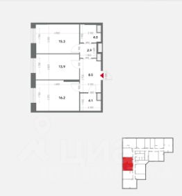 • Планировка: 2 отдельные спальни (15,3 и 13,9 м²) + кухня-гостиная 16,2 м²