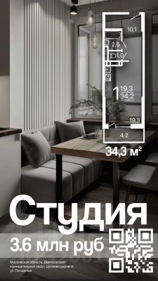 Общая площадь квартиры с лоджией составляет 34,3 кв. м, без лоджии — 32,9 кв. м.