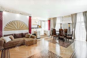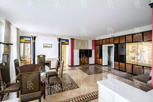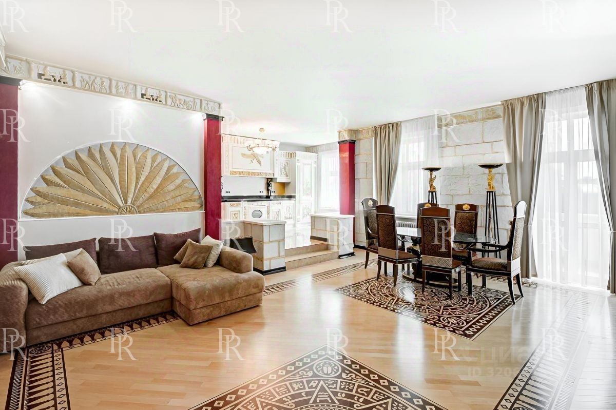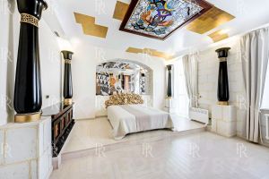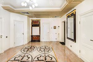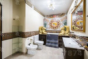 Квартира выполнена по индивидуальному дизайн-проекту в египетском стиле с использованием натурального камня, ценных пород дерева и мрамора. Интерьер оформлен с изысканностью и вниманием к деталям: мебель и предметы интерьера выполнены на заказ, установлена премиальная бытовая техника и сантехника.