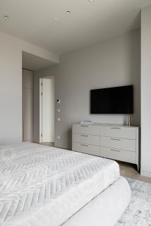 В отделке использованы премиальные натуральные материалы, пол- беленый дуб, столешница- камень, техника- люксовые европейские производители, система умный дом, климат - контроль, приточная система вентиляции, шторы на электроприводе.