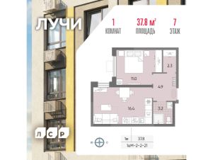 Продается 1-комнатная квартира общей площадью 37.8 кв. метров на 7 этаже жилого комплекса Лучи.