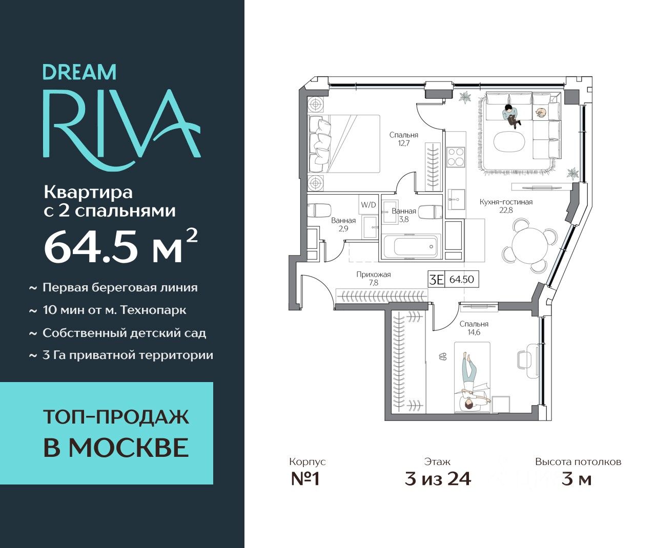 Продаётся Квартира с 2 спальнями квартира на 3 этаже 24-этажного дома (1 корпус).
