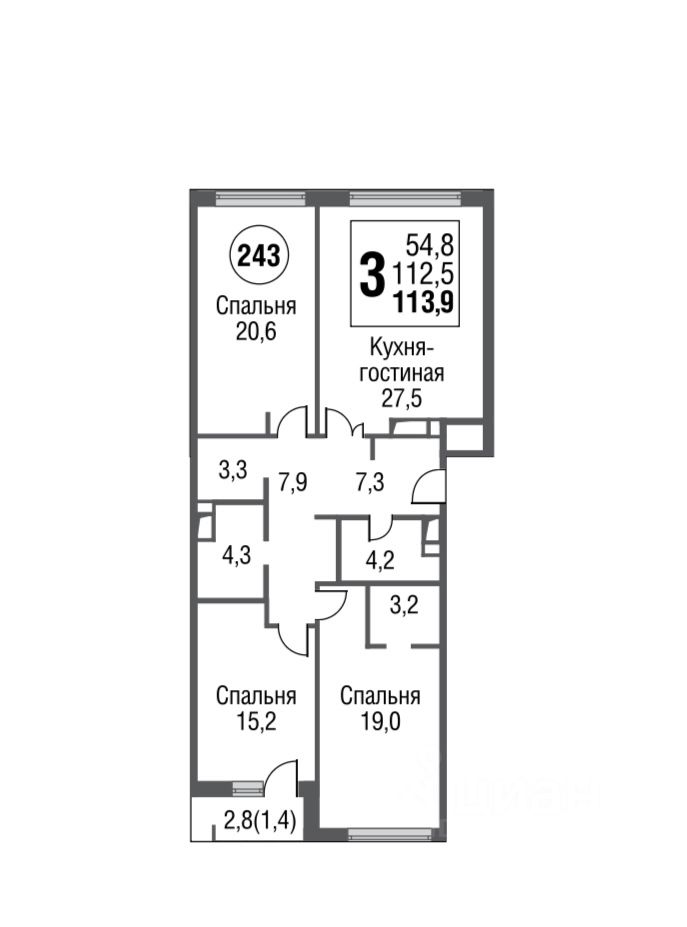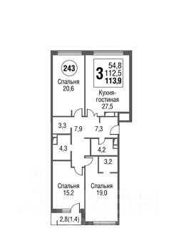 - 3-я Спальня 19 кв.м. с отдельной гардеробной 3,2 кв.м;