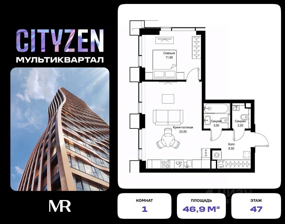 Продается 1-комнатная квартира от застройщика в жилом мультиквартале CITYZEN на 47-м этаже в корпусе #6 урбан-блока VOLNA. Общая площадь лота составляет 46.90 м²