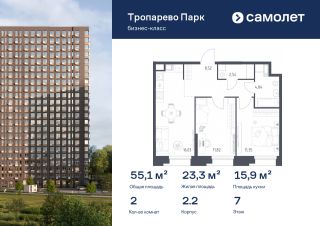Предлагаются 2-комнатные апартаменты бизнес-класса 55,1 кв.м в корпусе 2.2 на 7 этаже, в МФК "Тропарево Парк"