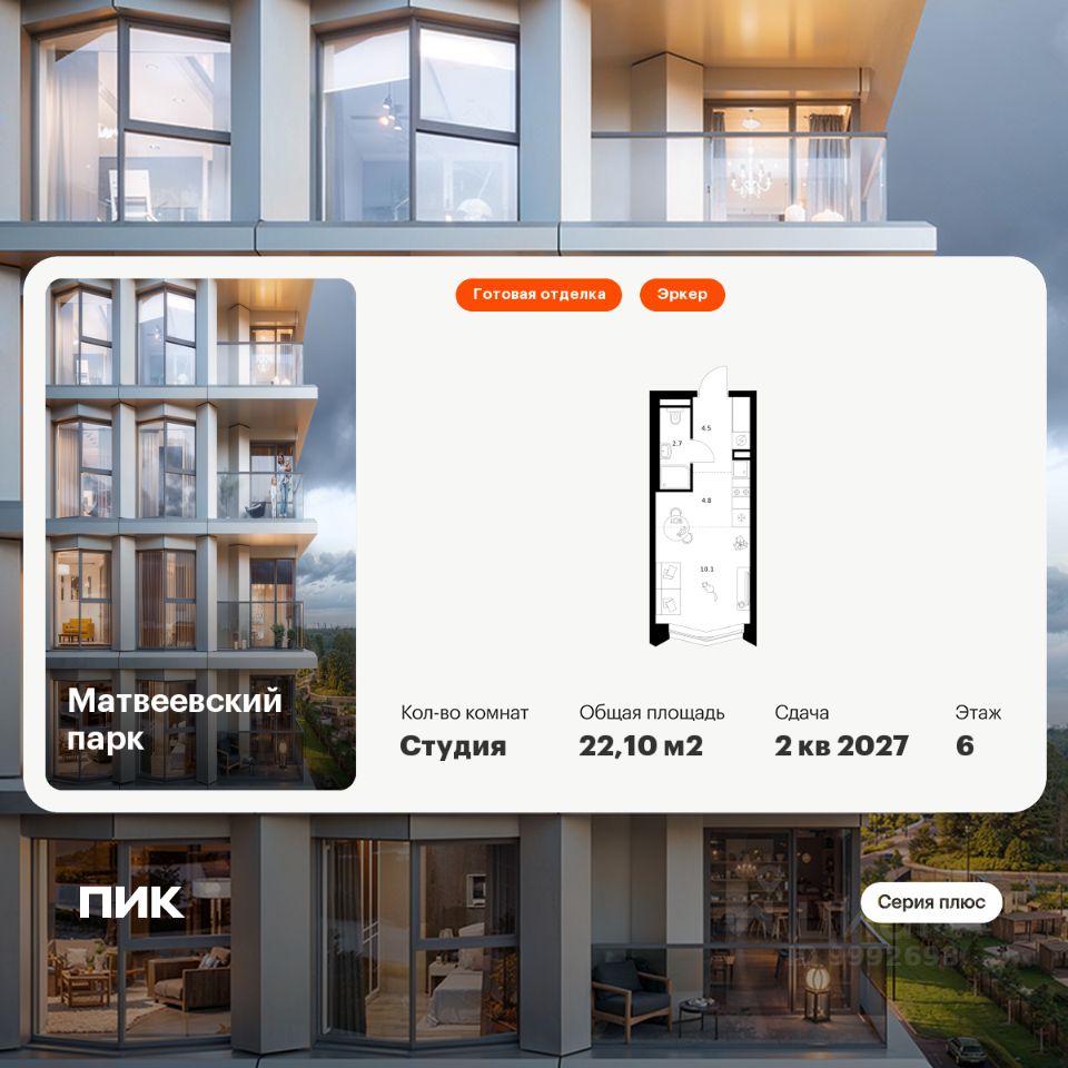 Продаётся квартира-студия площадью 22,1 кв.м на 6 этаже 31 этажного дома (Корпус 4.3, Секция 3) проекта ПИК Матвеевский парк. Светлый просторный подъезд на уровне земли, функциональная планировка, большие окна, c отделкой.