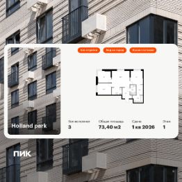 Продаётся 3-комн. квартира площадью 73,4 кв.м на 1 этаже 24 этажного дома (Корпус 8, Секция 2) проекта ПИК Holland park. Светлый просторный подъезд на уровне земли, функциональная планировка, большие окна, без отделки.