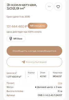 Видовая, современная, просторная трёшка на 45 этаже в новой инновационной башне ONE высотой 379 метров с современным ремонтом и мебелью. В Краснопресненском районе на Краснопресненской набережной с видом на город-герой Москву и деловой центр Москва-Сити. Расположена на границе Москва-Сити и нового района Сити-2, завершая формирование делового центра и открывая новую главу в развитии столицы. Архитектура здания - две башни, соединённые в нижней и верхней точках, - символизирует переход между настоящим и будущим. Она сочетает статус, выразительный облик и комфорт премиального уровня.