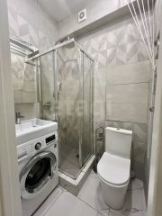 Апартаменты- студия, в которых есть все необходимое для жизни: от систем хранения, до посудомойки. Высокий потолок в сочетании с большим широким окном добавляют помещению простора, света. Планировка позволяет разместить кухонную зону, рабочий стол, а также зону отдыха с большим спальным местом.