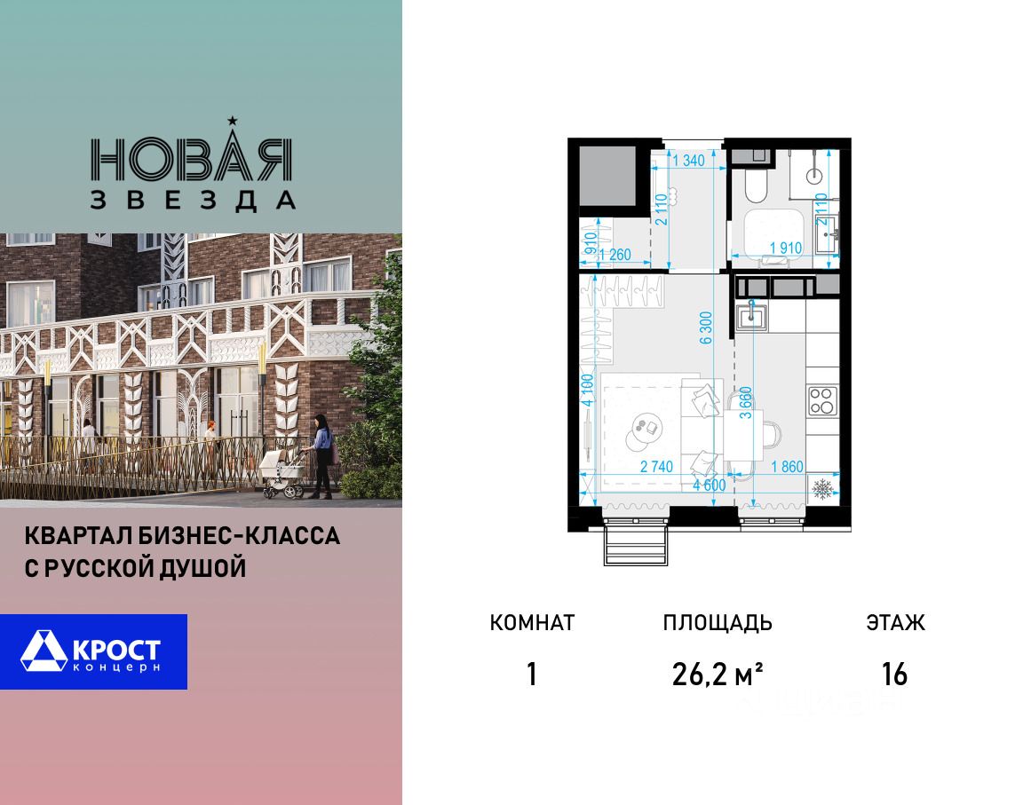 Прямая продажа от застройщика! Продаётся 1-к квартира 26.2 кв.м. в "ЖК "Новая Звезда"" на 16-м этаже 22 этажного дома.