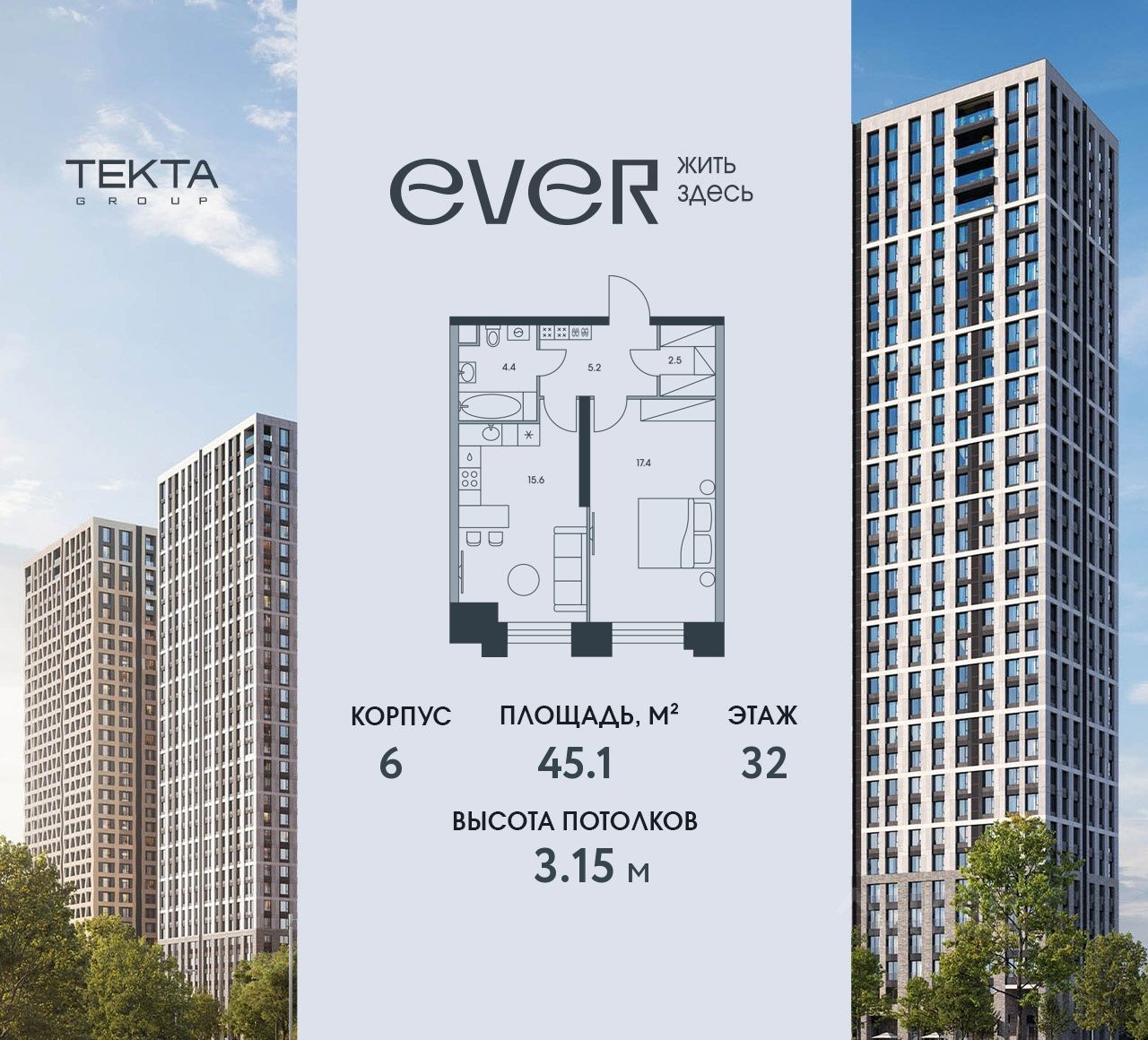 2-комн. квартира в ЖК "Ever" на 32 этаже в 34 этажном здании Корпус 6. Общая площадь: 45.1 кв.м., жилая: 26.2 кв.м. Высота потолков 3.15 м.