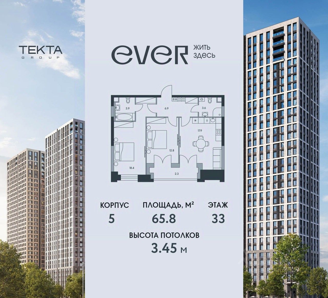 3-комн. квартира в ЖК "Ever" на 33 этаже в 34 этажном здании Корпус 5. Общая площадь: 65.8 кв.м., жилая: 40.4 кв.м. Высота потолков 3.45 м.