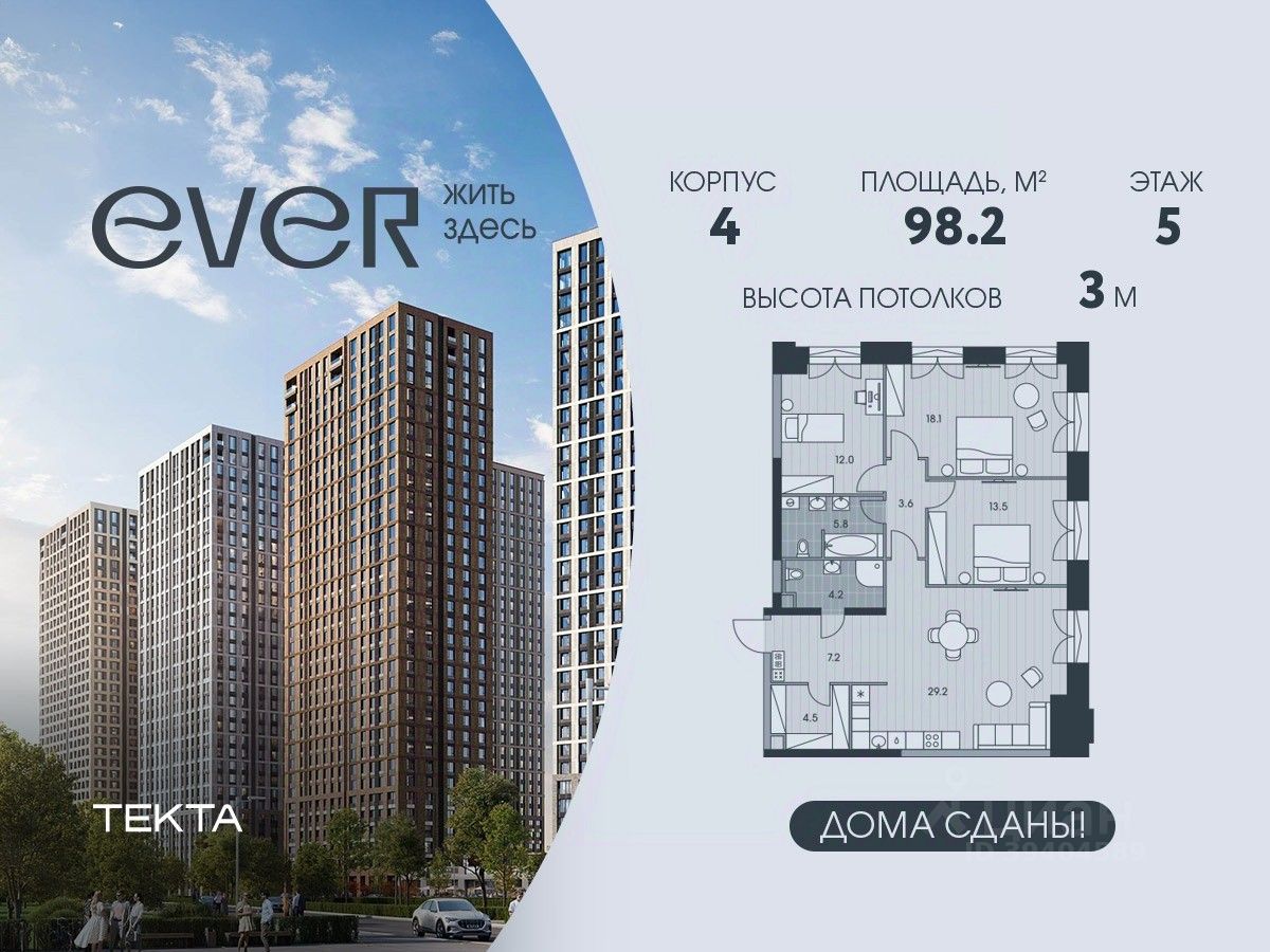4-комн. квартира в ЖК "Ever" на 5 этаже в 34 этажном здании Корпус 4. Общая площадь: 98.2 кв.м., жилая: 62.6 кв.м. Высота потолков 3.00 м.