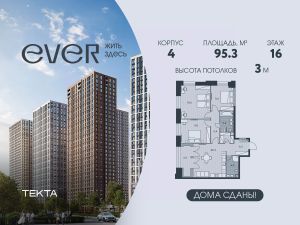 4-комн. квартира в ЖК "Ever" на 16 этаже в 34 этажном здании Корпус 4. Общая площадь: 95.3 кв.м., жилая: 59.1 кв.м. Высота потолков 3.00 м.