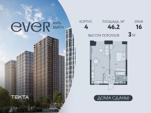 2-комн. квартира в ЖК "Ever" на 16 этаже в 34 этажном здании Корпус 4. Общая площадь: 46.2 кв.м., жилая: 27.4 кв.м. Высота потолков 3.00 м.