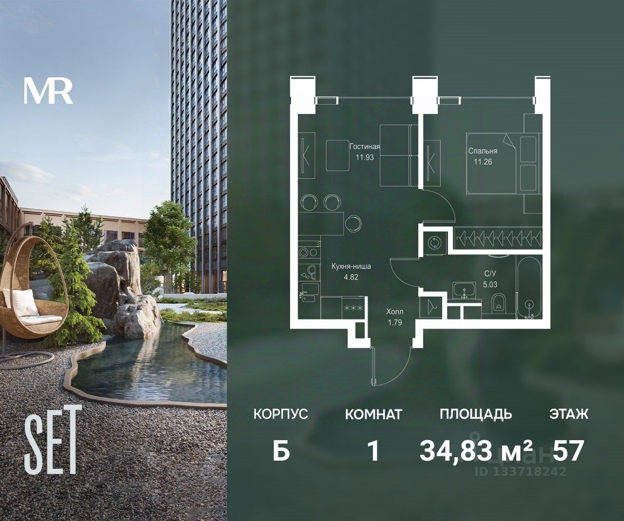 В ЖК SET продается 1-комнатная квартира площадью 34.83 м², расположенная в корпусе Б, на 57 этаже 59 этажного дома.