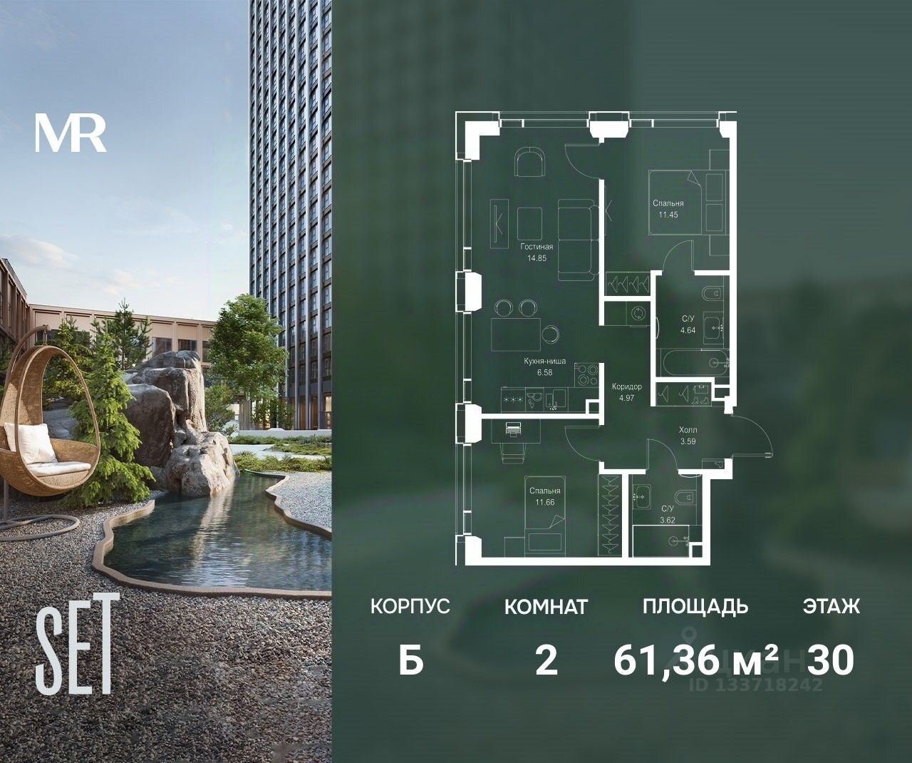 В ЖК SET продается 2-комнатная квартира площадью 61.36 м², расположенная в корпусе Б, на 30 этаже 59 этажного дома.