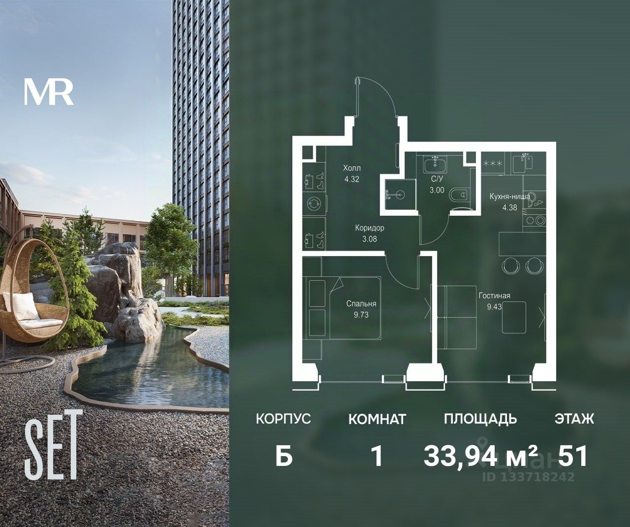 В ЖК SET продается 1-к квартира площадью 33.94 м², расположенная в корпусе Б, на 51 этаже 59 этажного дома.
