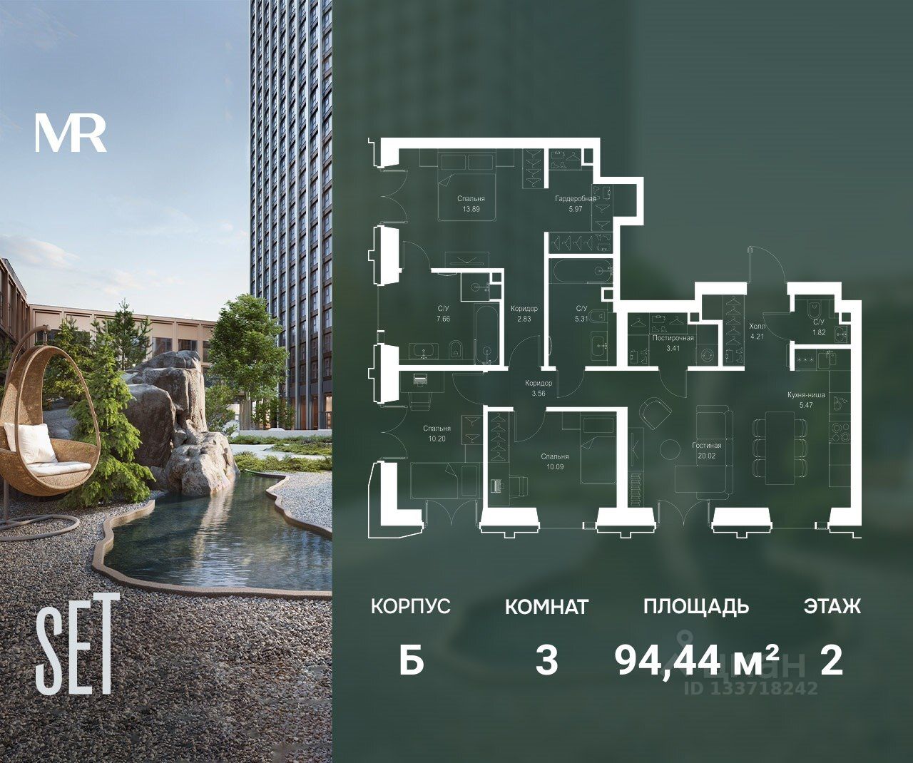 В ЖК SET продается 3-к квартира площадью 94.44 м², расположенная в корпусе Б, на 2 этаже 59 этажного дома.