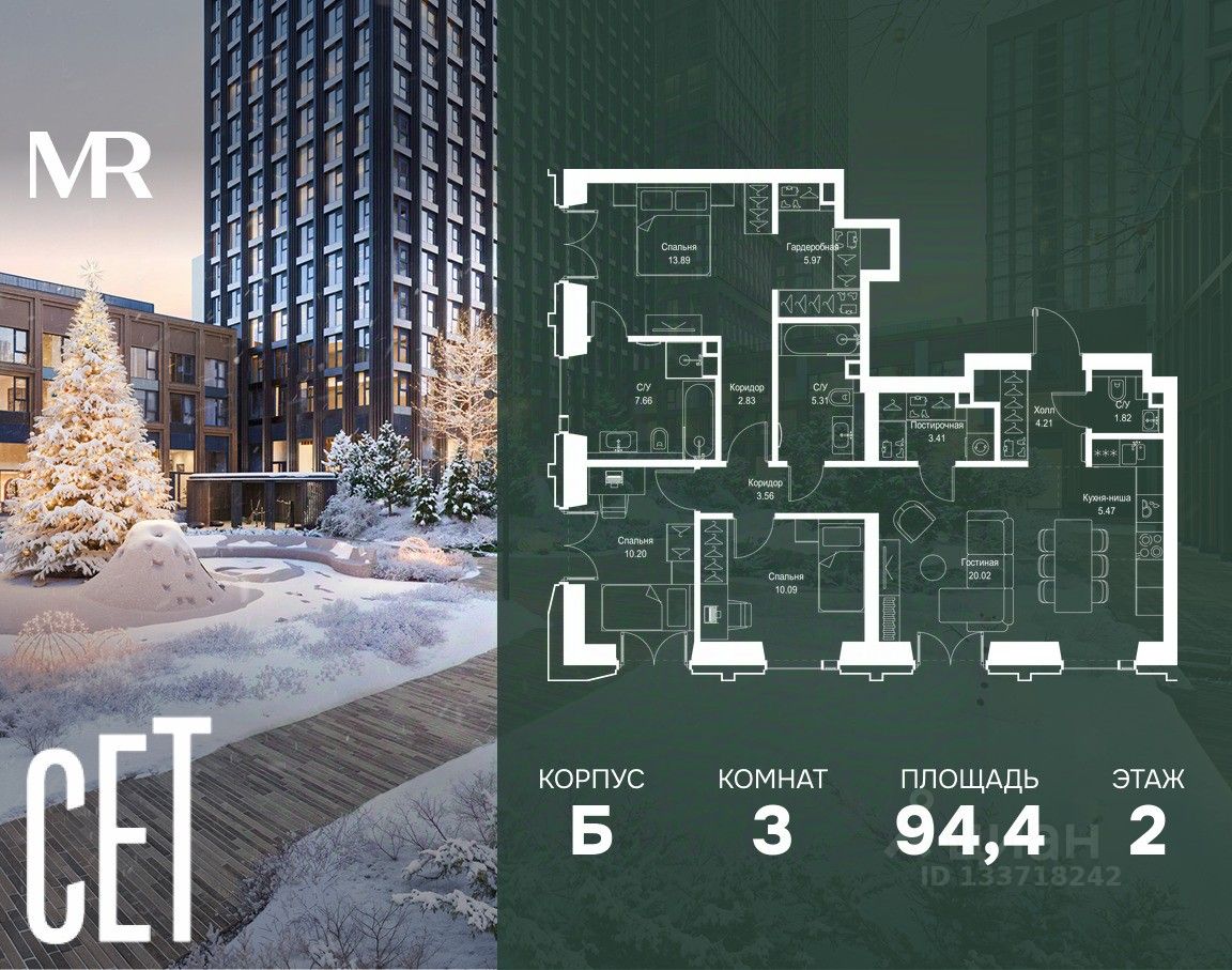 В ЖК Сет продается 3-комнатная квартира площадью 94.44 м², расположенная в корпусе Б, на 2 этаже 59 этажного дома.