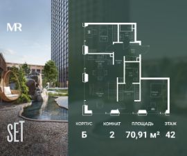 В ЖК SET продается 2-комнатная квартира площадью 70.91 м², расположенная в корпусе Б, на 42 этаже 59 этажного дома.