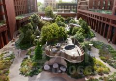 Двор разделен на 4 зоны разных эмоций и действий, которые пересечены и соединены веерными прогулочными маршрутами: