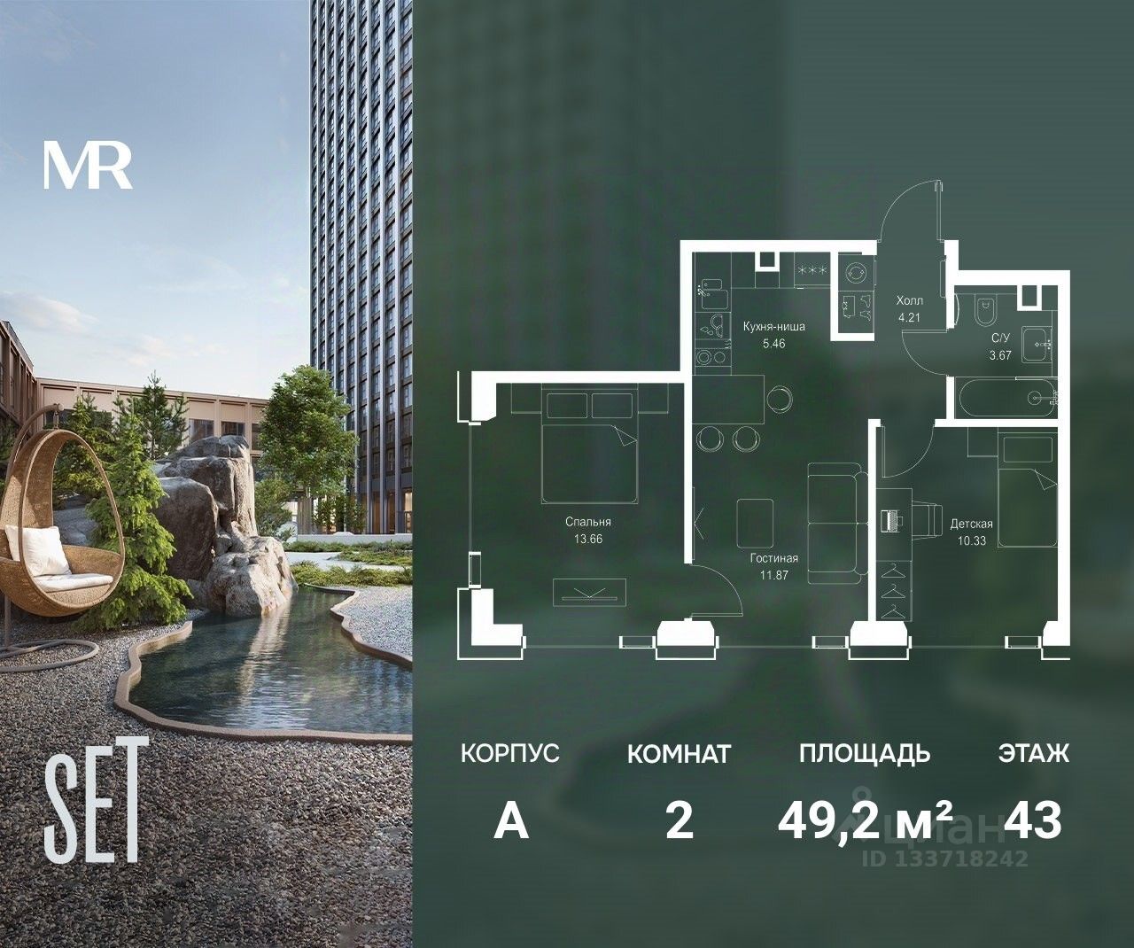 В ЖК SET продается 2-комнатная квартира площадью 49.20 м², расположенная в корпусе А, на 43 этаже 52 этажного дома.