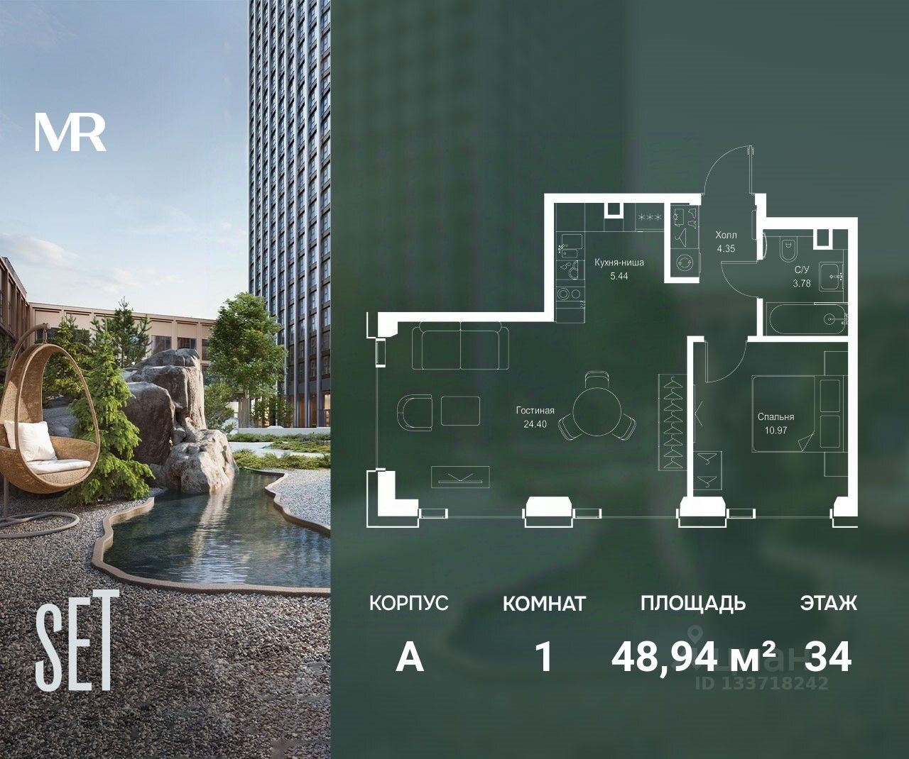 В ЖК SET продается 1-комнатная квартира площадью 48.94 м², расположенная в корпусе А, на 34 этаже 52 этажного дома.