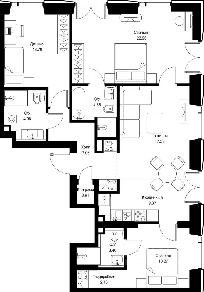 В ЖК SET продается 3-комнатная квартира площадью 97.07 м², расположенная в корпусе А, на 2 этаже 52 этажного дома.
