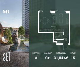 В ЖК SET продается студия площадью 31.84 м², расположенная в корпусе А, на 15 этаже 52 этажного дома.