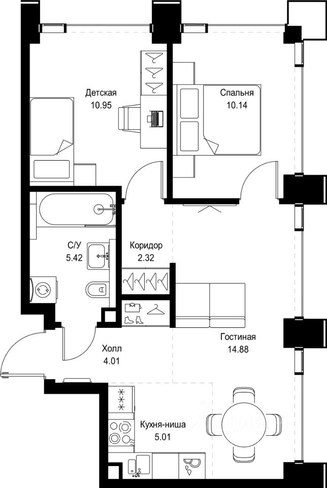 В ЖК SET продается 2-комнатная квартира площадью 52.73 м², расположенная в корпусе А, на 49 этаже 52 этажного дома.