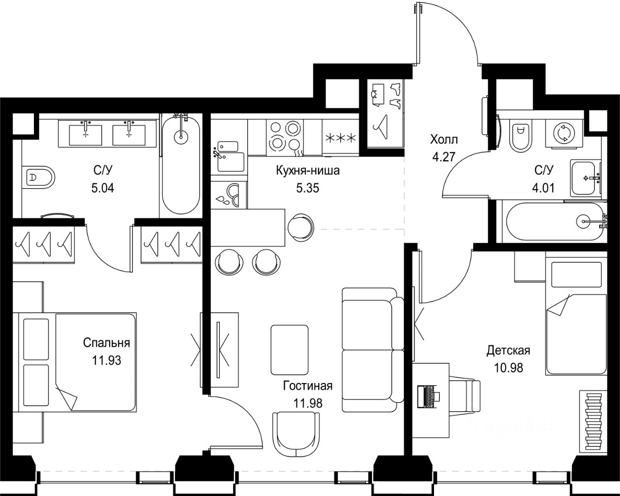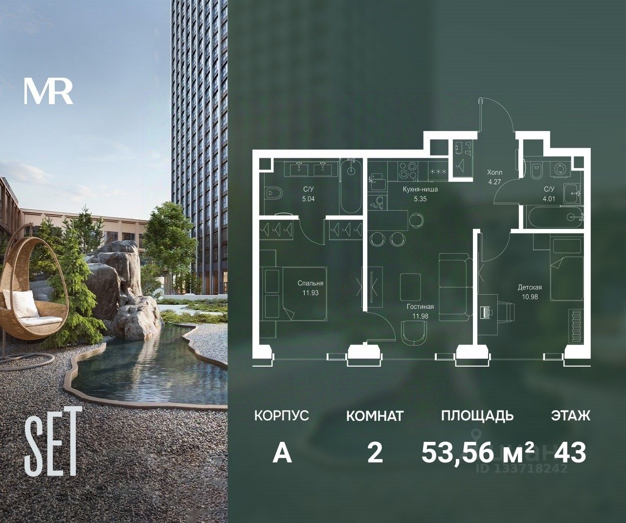 В ЖК SET продается 2-комнатная квартира площадью 53.56 м², расположенная в корпусе А, на 43 этаже 52 этажного дома.