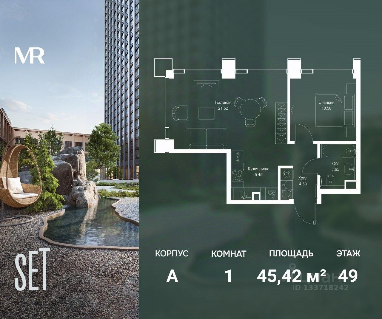 В ЖК SET продается 1-к квартира площадью 45.42 м², расположенная в корпусе А, на 49 этаже 52 этажного дома.