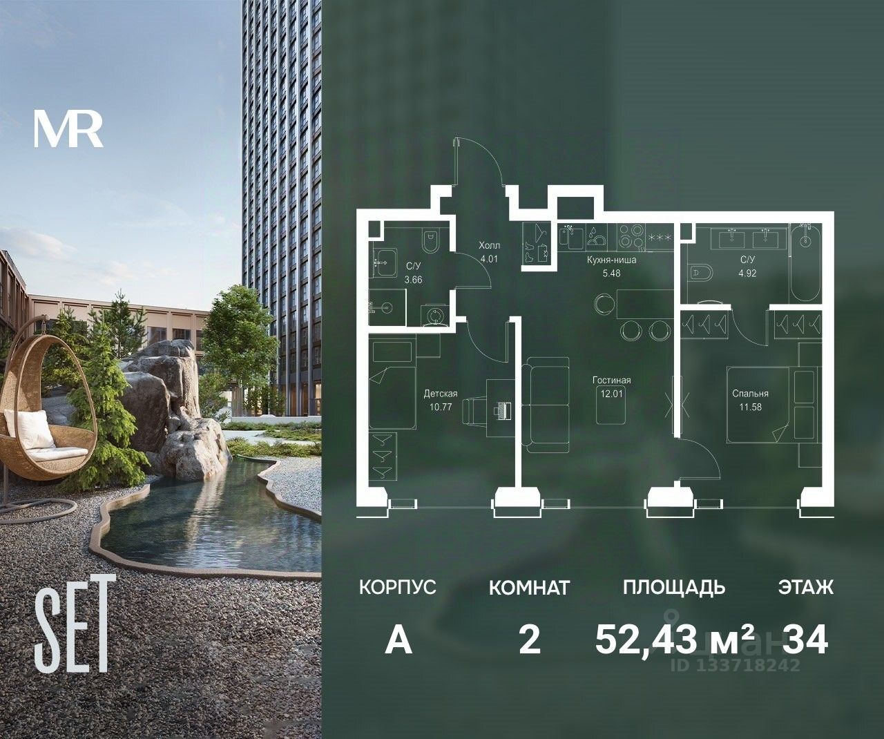 В ЖК SET продается 2-комнатная квартира площадью 52.43 м², расположенная в корпусе А, на 34 этаже 52 этажного дома.