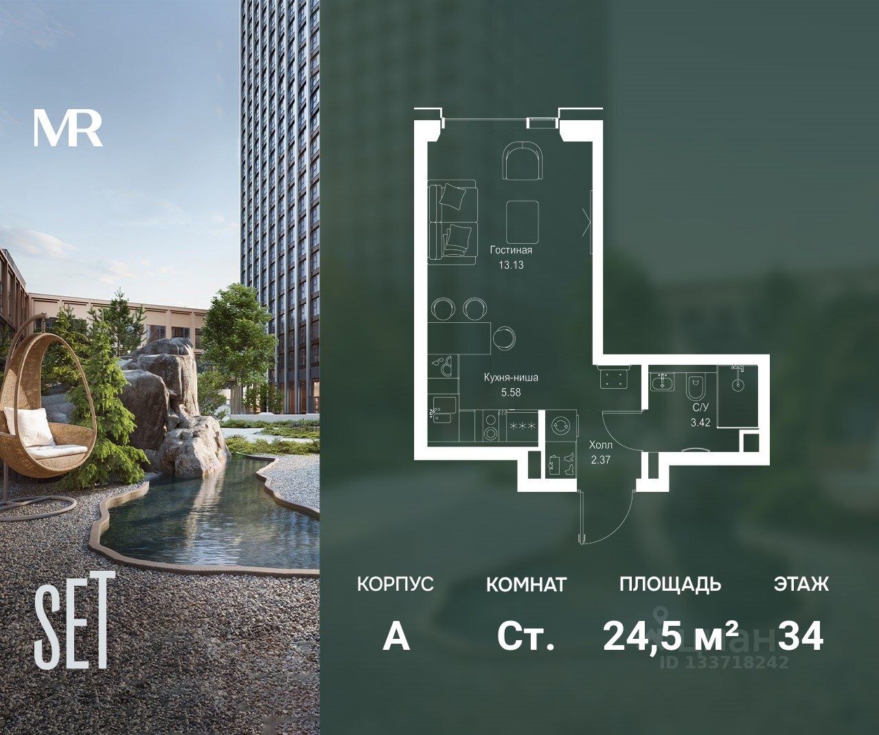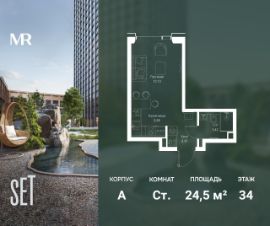 В ЖК SET продается студия площадью 24.50 м², расположенная в корпусе А, на 34 этаже 52 этажного дома.