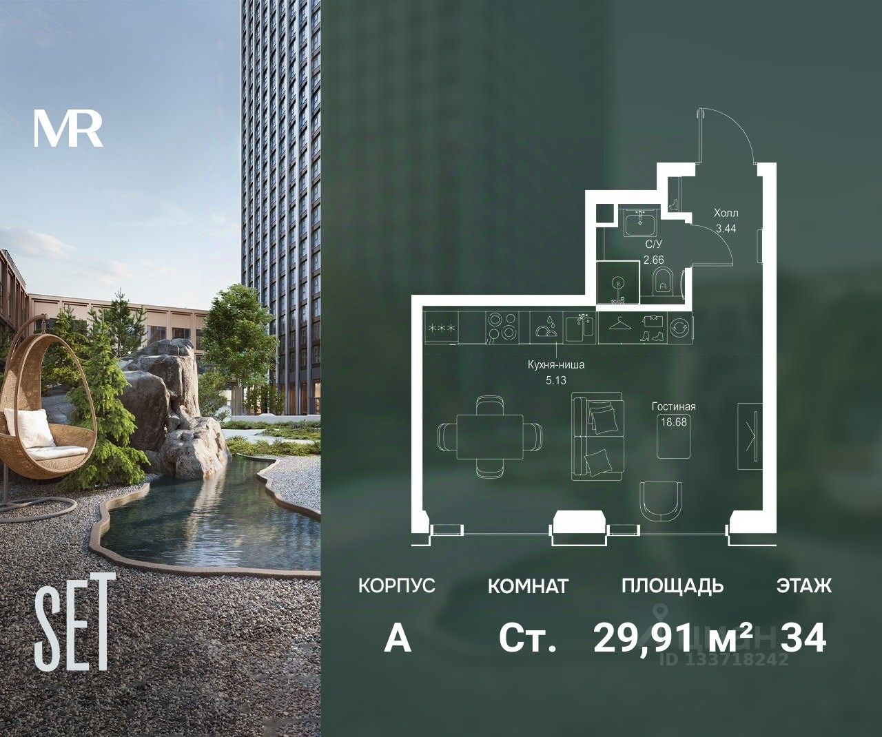 В ЖК SET продается студия площадью 29.91 м², расположенная в корпусе А, на 34 этаже 52 этажного дома.