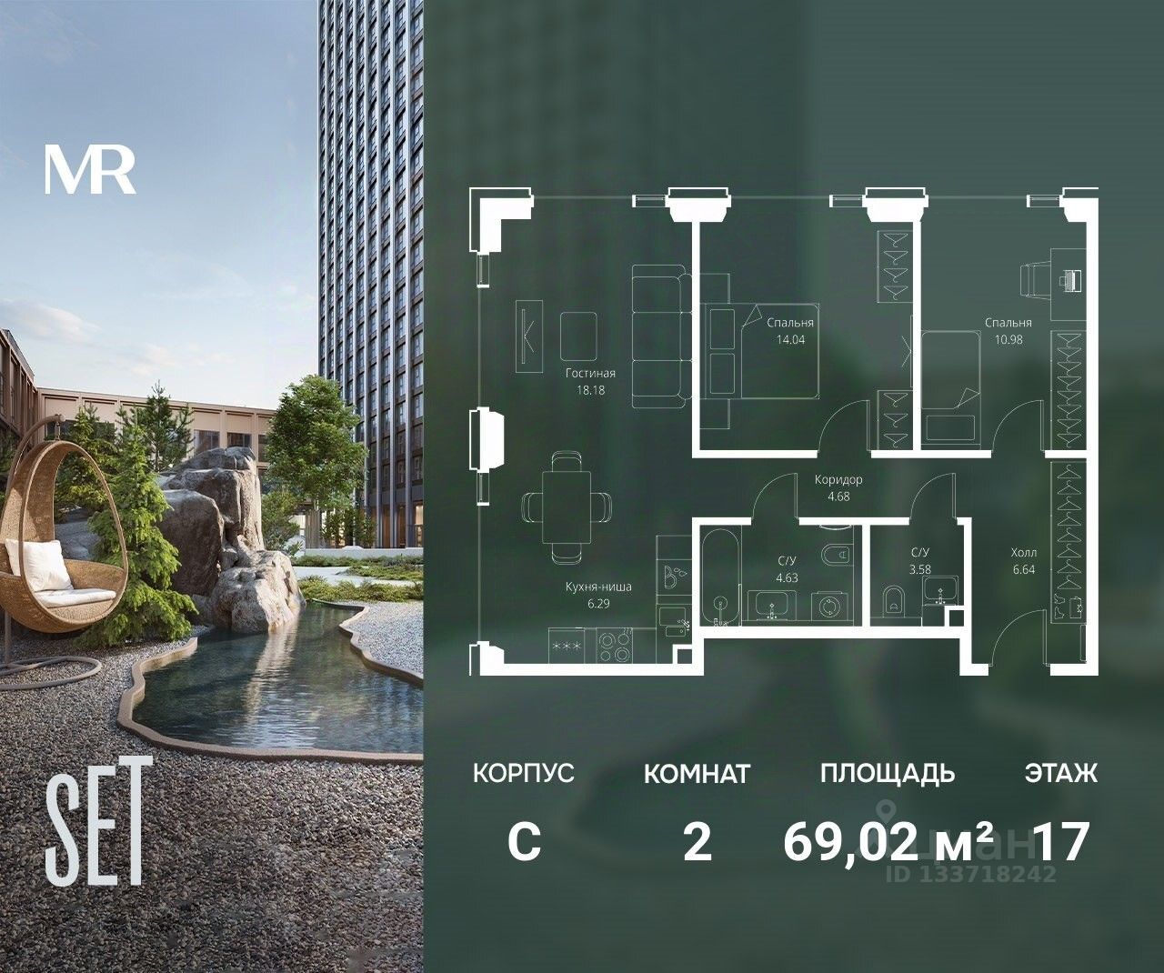 В ЖК SET продается 2-комнатная квартира площадью 69.02 м², расположенная в корпусе С, на 17 этаже 28 этажного дома.