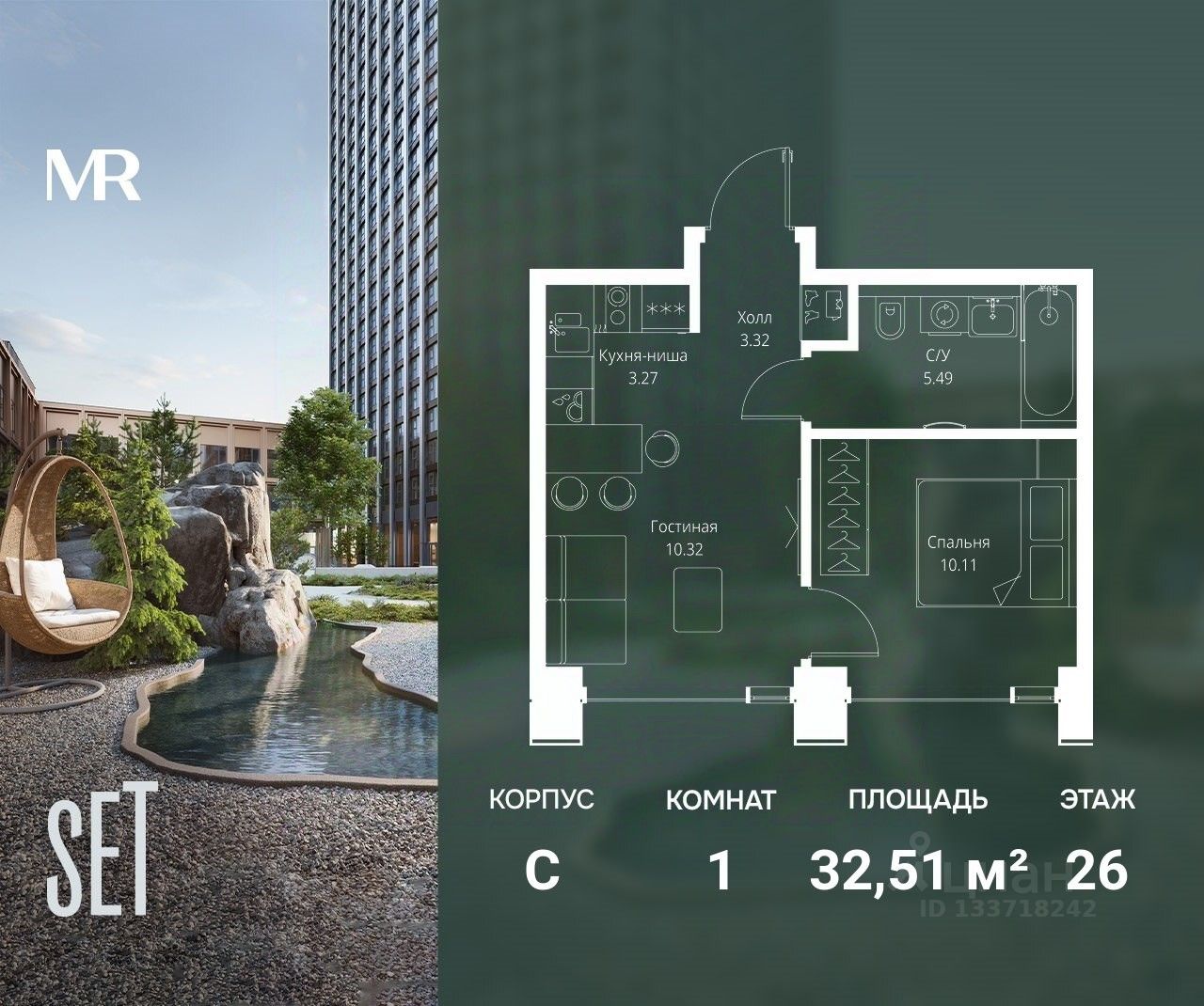 В ЖК SET продается 1-комнатная квартира площадью 32.51 м², расположенная в корпусе С, на 26 этаже 28 этажного дома.