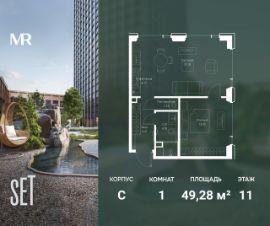 В ЖК SET продается 1-к квартира площадью 49.28 м², расположенная в корпусе С, на 11 этаже 28 этажного дома.