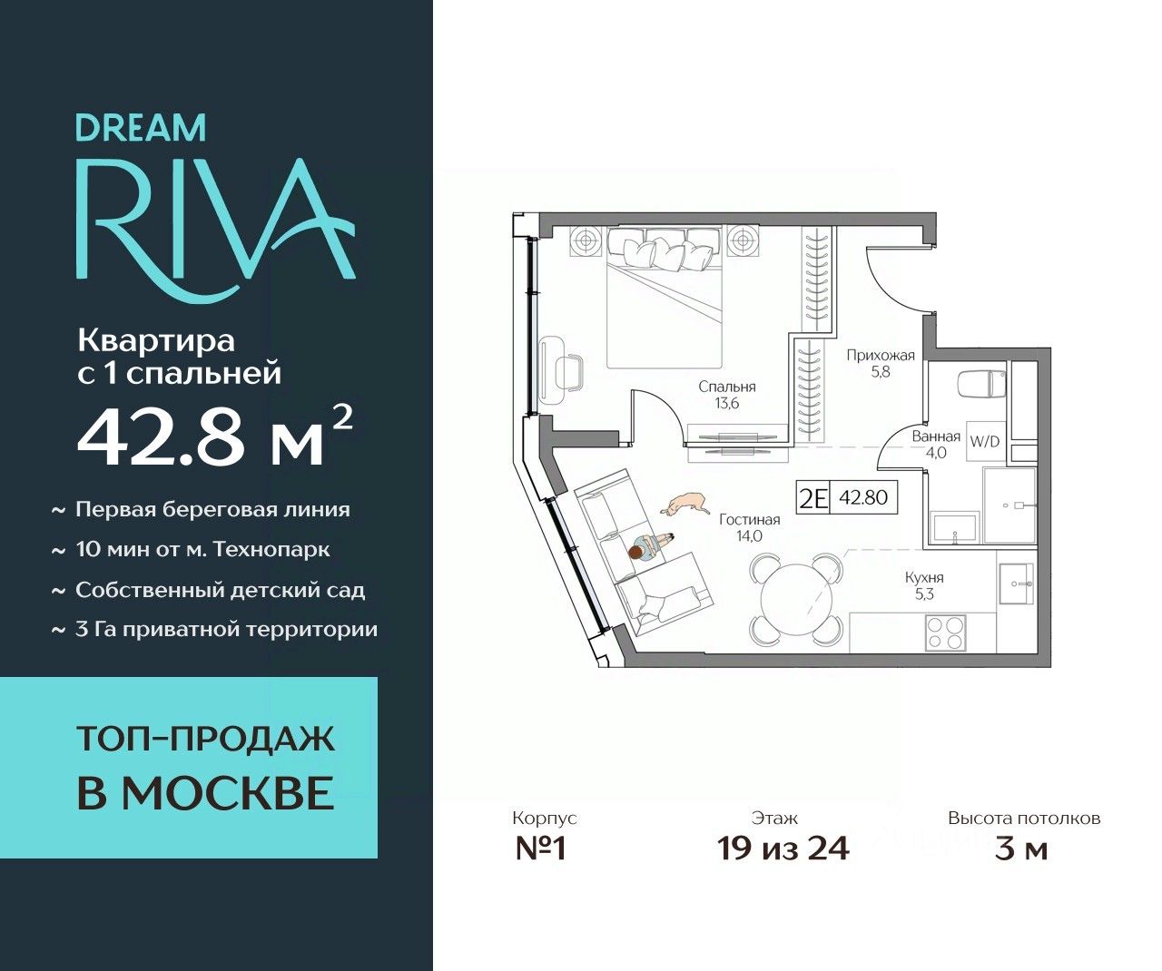 Продаётся Квартира с 1 спальней квартира на 19 этаже 24-этажного дома (1 корпус).