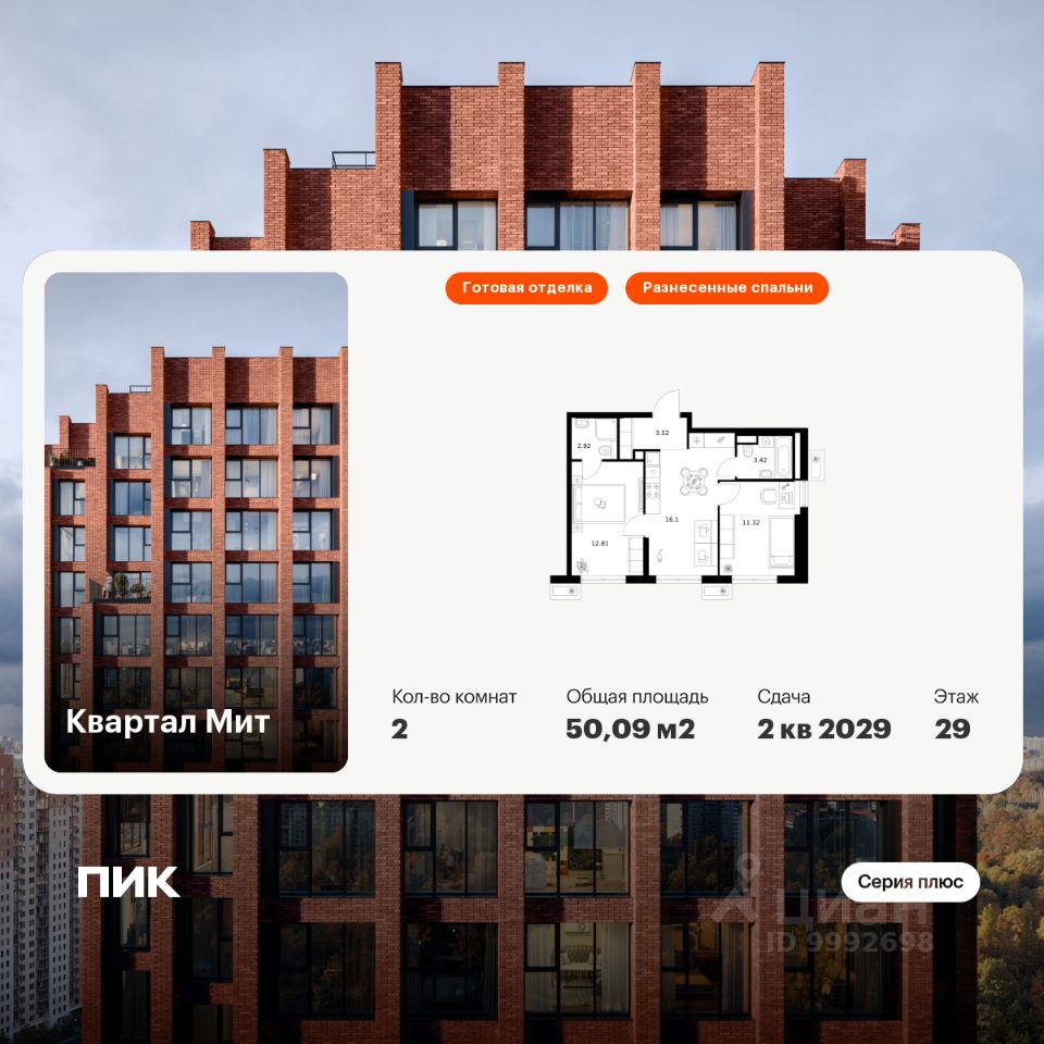 Новостройка! Продается 2-комн. кв-ра площадью 50,09 кв.м, (Корпус 3.4, Секция 4) 29 этаж 32-этажного дома в Квартал Мит от ПИК. "Квартал Мит" строится в экологически чистом районе Митино, где по соседству расположен большой лесопарк, а с двух сторон протекают реки Сходня и Журавка. Для семей с детьми здесь появится школа и два детских сада.