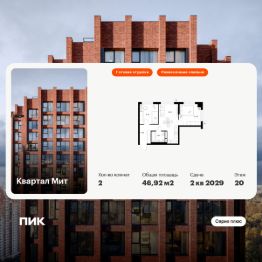 Новостройка! Продается 2-комн. кв-ра площадью 46,92 кв.м, (Корпус 3.4, Секция 4) 20 этаж 32-этажного дома в Квартал Мит от ПИК. "Квартал Мит" строится в экологически чистом районе Митино, где по соседству расположен большой лесопарк, а с двух сторон протекают реки Сходня и Журавка. Для семей с детьми здесь появится школа и два детских сада.