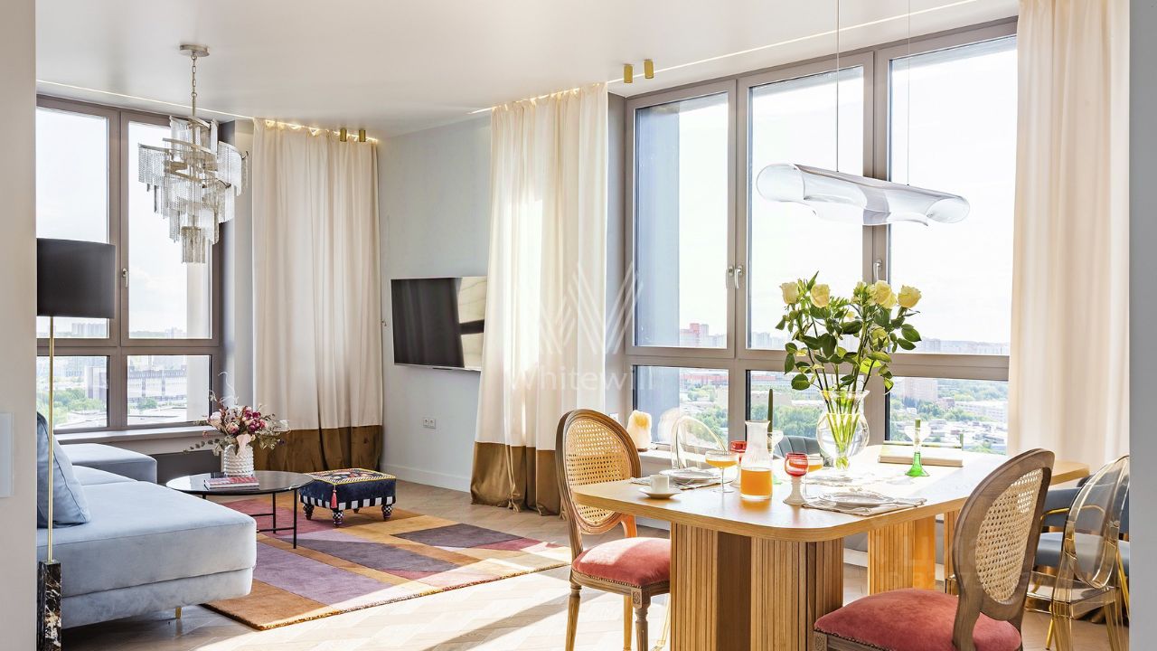 Видовая квартира с двумя спальнями общей площадью 75 м² в комплексе премиум-класса Onyx Deluxe на 32-м этаже. Светлый интерьер оформлен в стиле арт-деко с яркими акцентами. Продуманы различные сценарии освещения — дизайнерские люстры, настенные светильники и споты. Уникальные двери высотой более двух с половиной метров изготовлены на заказ специально под интерьер.