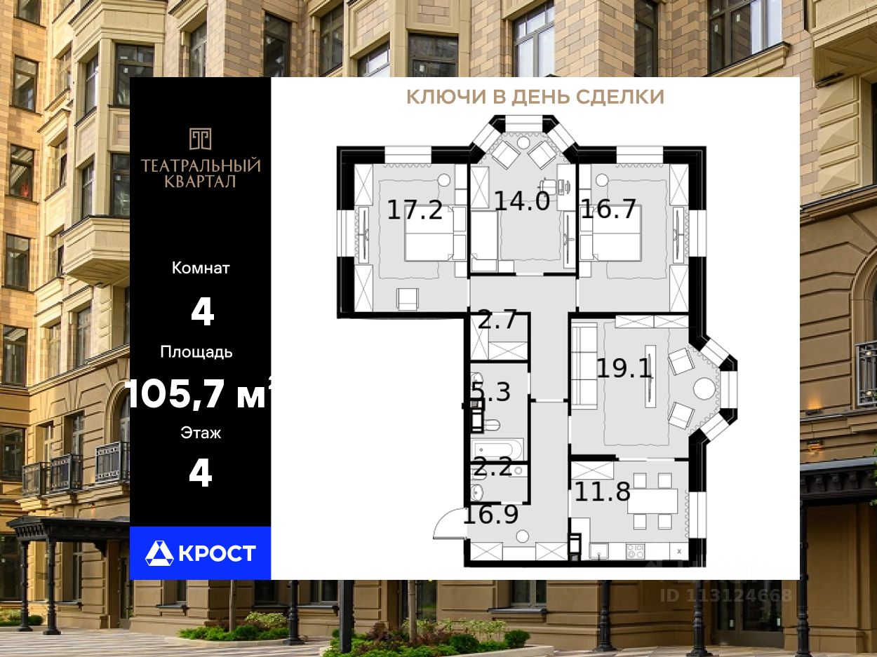 Площадь квартиры составляет 105,7 кв.м и находится на 4-ом этаже 19-этажного здания. Концепция комплекса вдохновлена театральной тематикой, предлагая сочетание неоклассической архитектуры с оригинальной отделкой холлов, изысканными фасадами и созданием культурно-просветительского пространства.