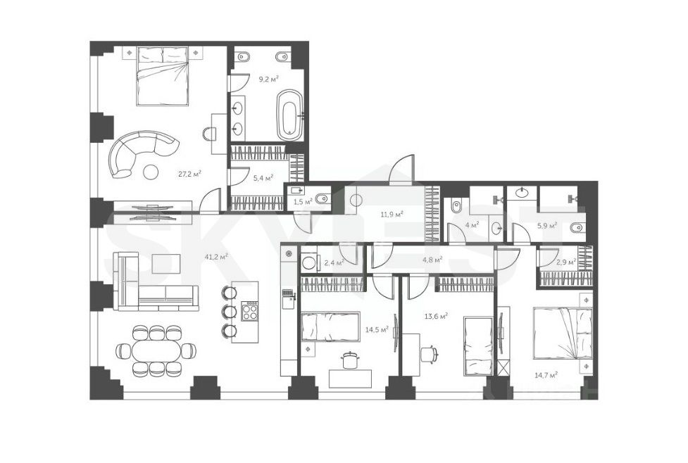 Планировка: кухня-гостиная, мастер-спальня с собственной гардеробной и ванной комнатой, 3 спальни, гардеробная, 2 санузла, постирочная.